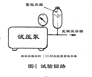 4、本试压泵一般不适宜以做小型压力容器试验,如若要进行小型压力容器试验,(容积<4L-10L为了利于保压,试验回路应配置不小于10L的蓄能容器。如图4)。这时先逆时针打开溢流阀手柄,让其处于开启状态,起动电动机,泵开始正常工作,被试容器进行充水,充满水后,压力徐徐上升,此时缓慢顺时针拧紧溢流阀手柄,直止达到所要求的试验压力,稳定后锁紧溢流阀手柄,停机保压到要求时间,检查被试容器。以后泵再试验同样的压力,无需再调定溢流阀压力。