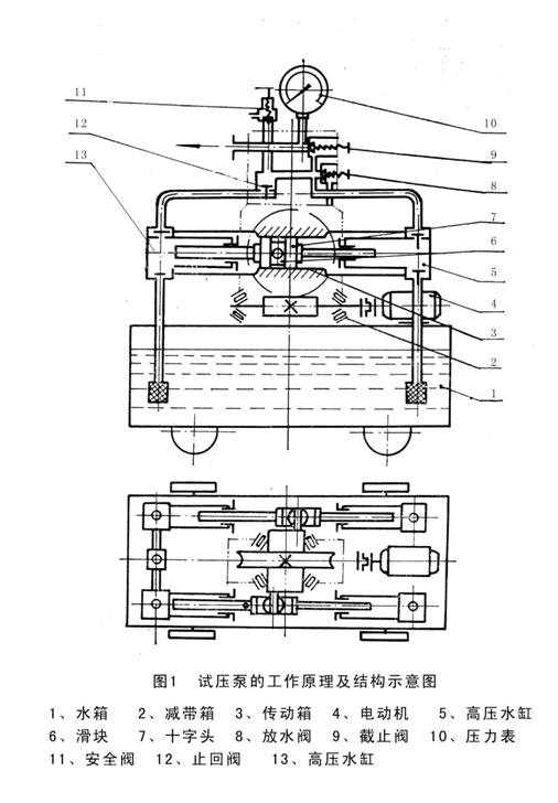 在柱塞的往复作用下,4只水缸内的工作容积形成周期变化。当柱塞为吸入行程时,出水阀关闭,随水缸工作容积的增大,缸内形成真空,水箱内的工作介质在大气压力的作用下,通过滤网、吸水管、顶开进水阀进入缸体内。当柱塞为排出行程时,进水阀关闭,出水阀被迫开启,柱塞将工作介质通过出水阀输入集水器,输送到被试容器内,直至达到某一预定的试验压力,实现试压的目的。