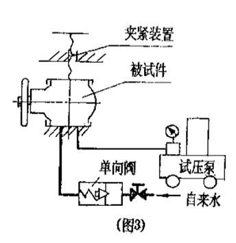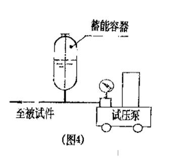 2、将被试容器与试压泵的排出口连接起来,大中型压力容器(容积>10L),在试验前先用清水灌满被试容器,或采用单向阀借助自来水自动灌水(如图3),微小型压力容器(容积<4L),为了利于保压,试验回路应配置蓄能容器。见(图4)。