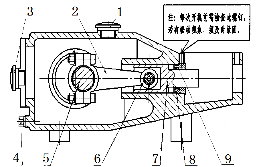 1、注油孔(气螺塞) 2、连杆 3、油窗 4、放油螺塞 5、曲轴