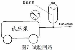 2、用高压管将被试容器与泵的排出口连接起来,大型压力容器(容积>10L~20L),在试验前先用试验介质灌满,小型压力容器,为了利于保压,最好在试验回路中配置一个足够容量的(不小于4L)蓄能容器。如(图7)。